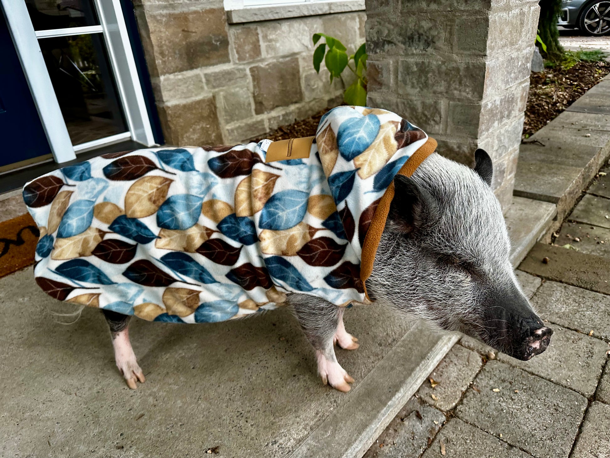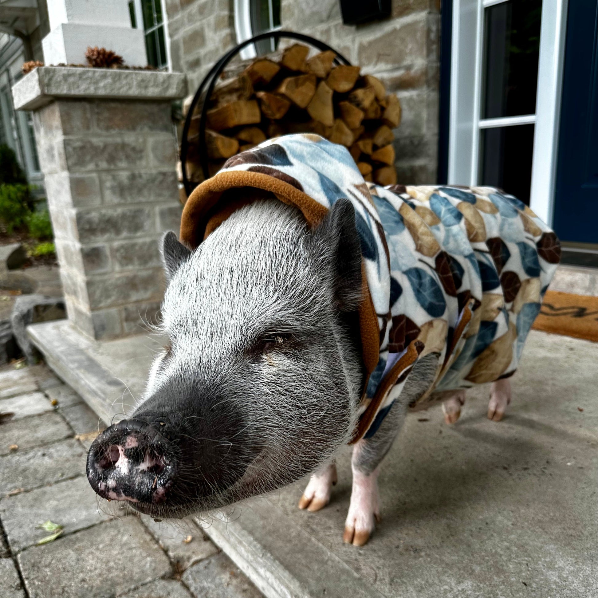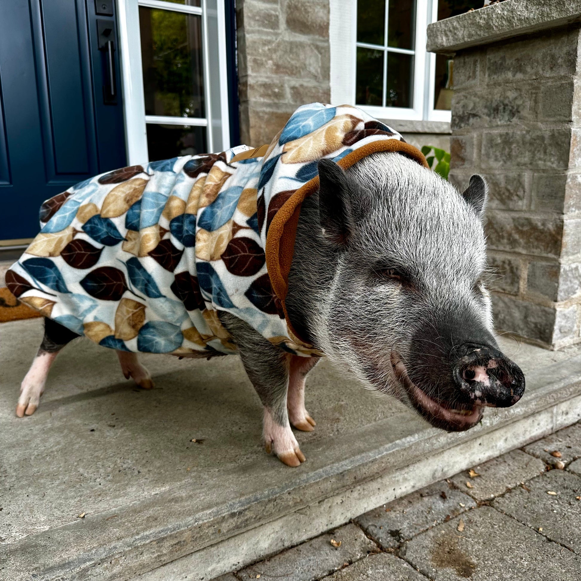 Le polar feuilles est parfait comme manteau d'automne et d'hiver puisqu'il est fait de deux épaisseurs de polar le rendant très chaud! Il est conçu à la main spécialement pour l'anatomie du cochon. Les ganses ajustables sont à boutons-pression (snaps) permettant un bon ajustement selon la taille de votre cochon. Il a une ouverture située sur le dos, au niveau du cou, permettant d'être porté avec un ensemble harnais et laisse.