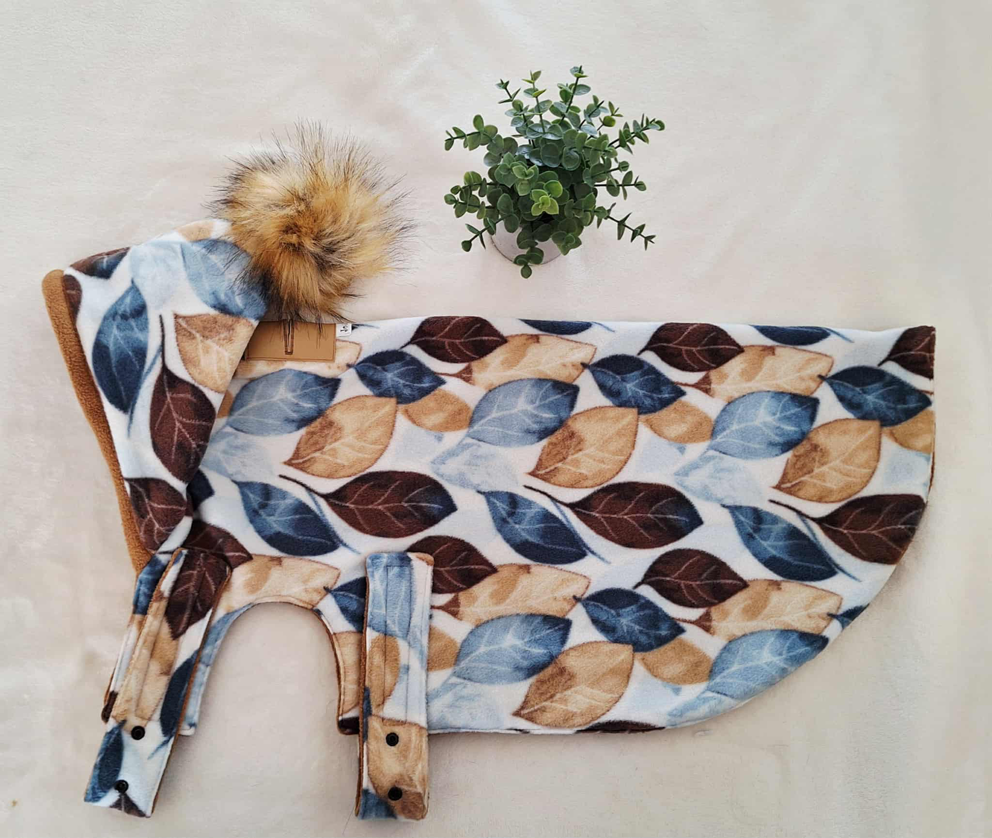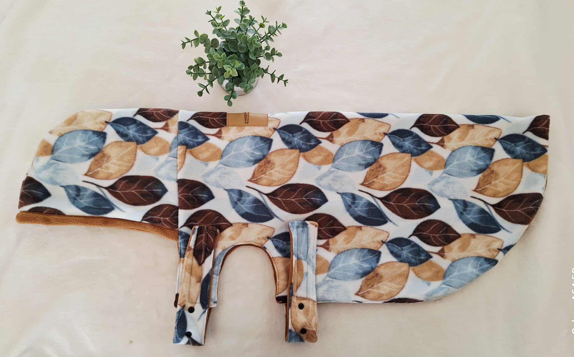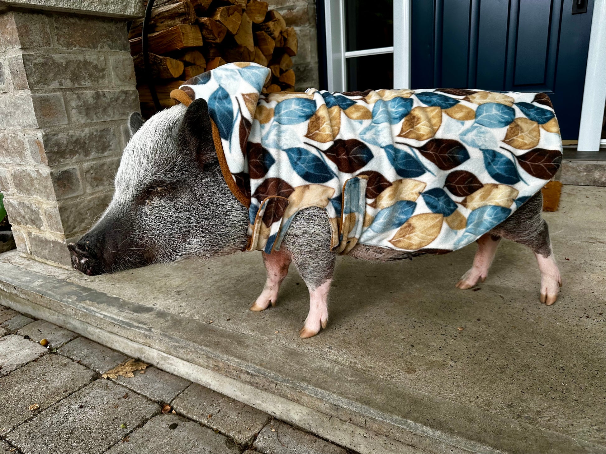 Le polar feuilles est parfait comme manteau d'automne et d'hiver puisqu'il est fait de deux épaisseurs de polar le rendant très chaud! Il est conçu à la main spécialement pour l'anatomie du cochon. Les ganses ajustables sont à boutons-pression (snaps) permettant un bon ajustement selon la taille de votre cochon. Il a une ouverture située sur le dos, au niveau du cou, permettant d'être porté avec un ensemble harnais et laisse.