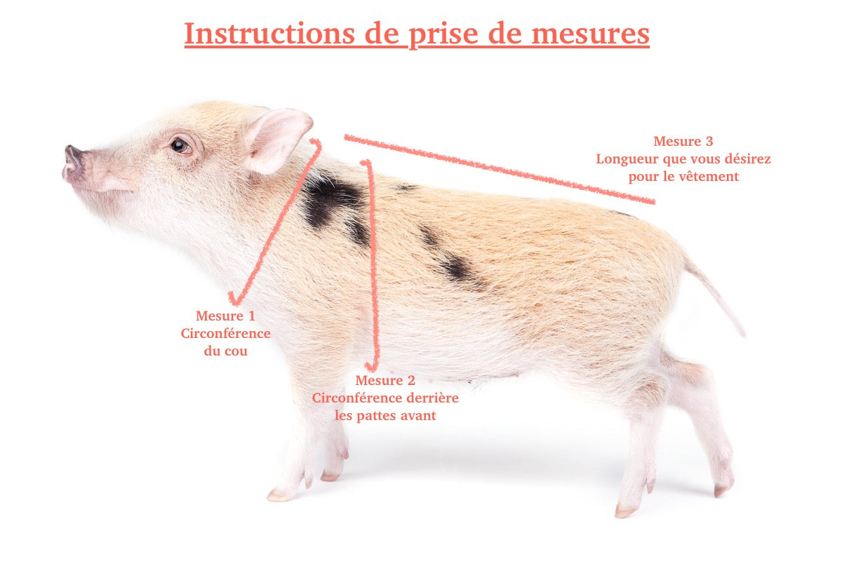 Pour déterminer la taille convenant à votre cochon, regardez la photo Instructions de prise de mesure et consulter les grandeurs ci-dessous: